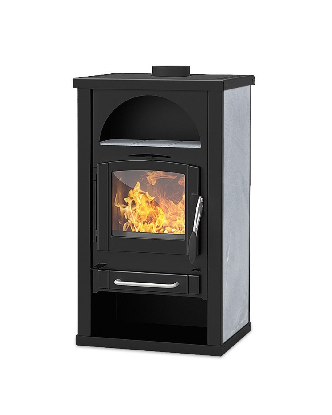 Een tradionele houtkachel met warmhoutvak. De afwerking is beschikbaar in een zwarte of grijze staalmantel of met een speksteenmantel. Het warmhoudvak kan afgewerkt worden in donker antraciet of speksteen.