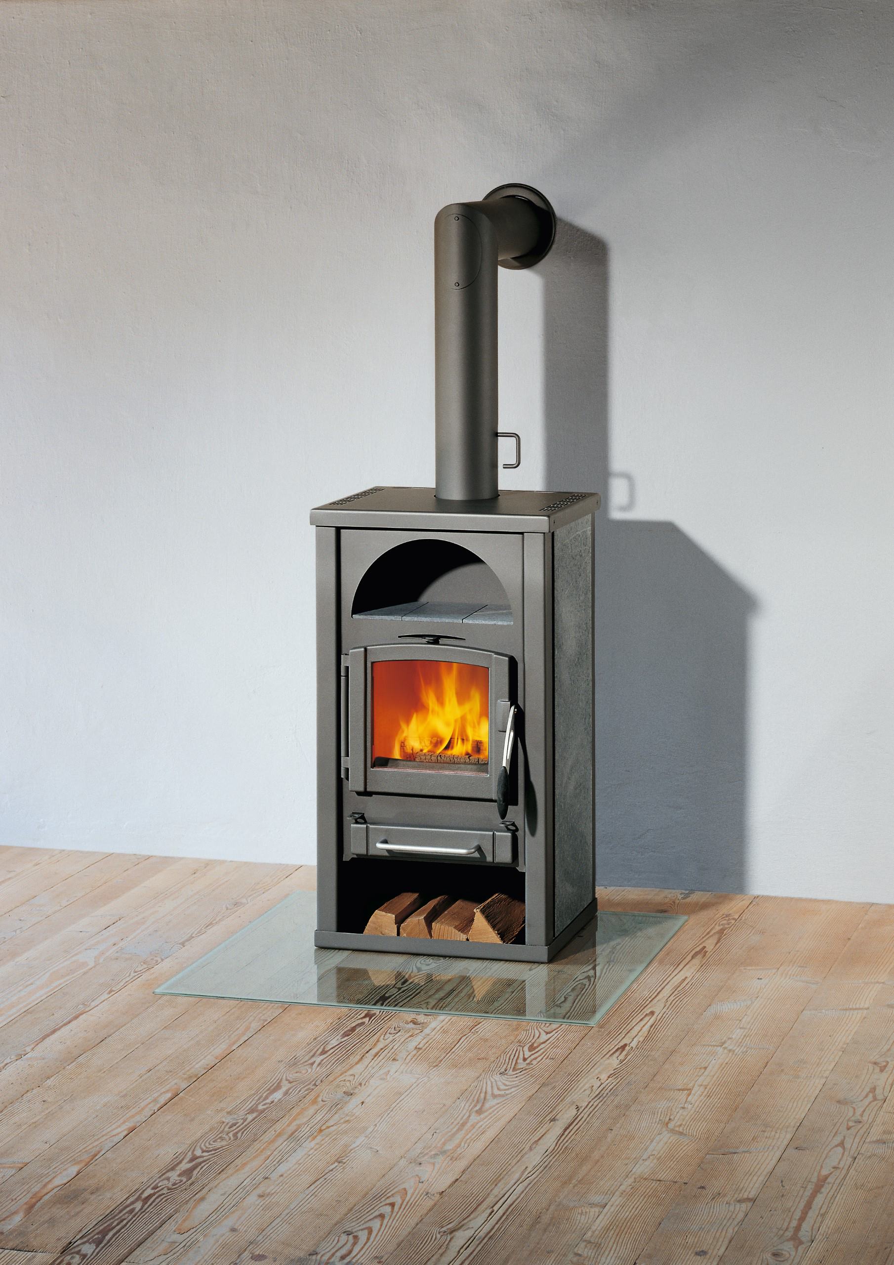 Een tradionele houtkachel met warmhoutvak. De afwerking is beschikbaar in een zwarte of grijze staalmantel of met een speksteenmantel. Het warmhoudvak kan afgewerkt worden in donker antraciet of speksteen.